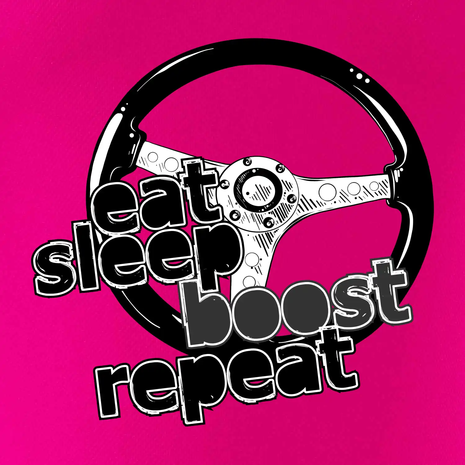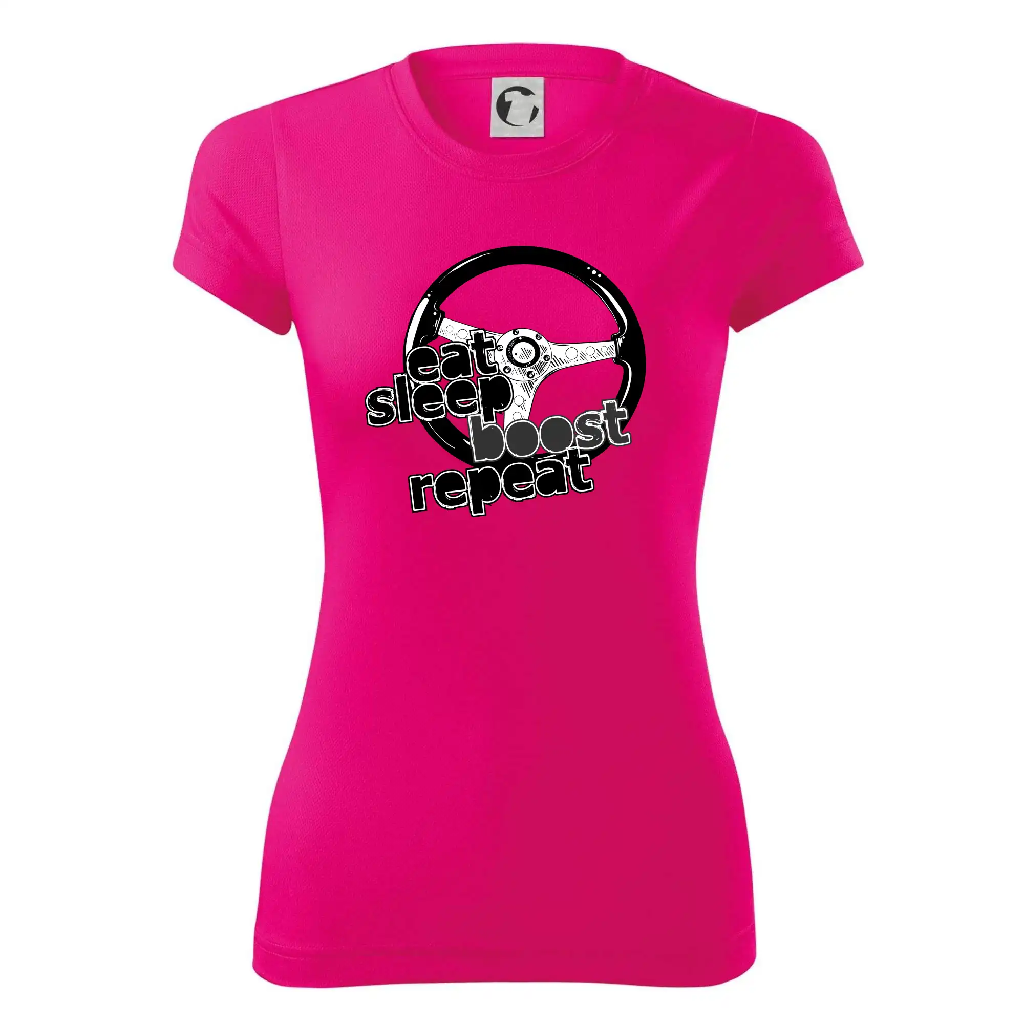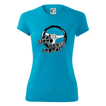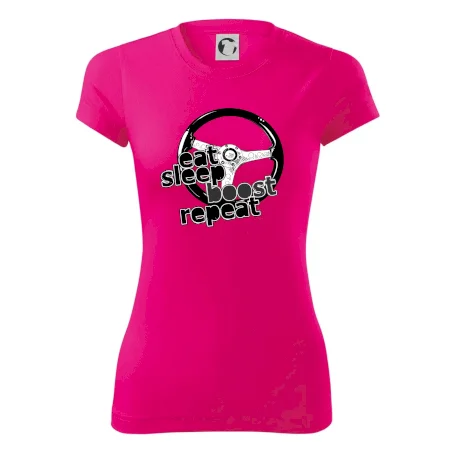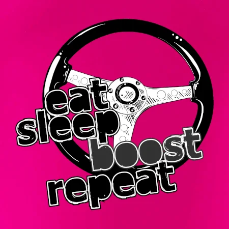 Triko pro řidiče s nápisem "Eat Sleep Boost repeat". Tohle triko za volant by měl mít každý zapálený řidič. Dárek pro automobilového závodníka.