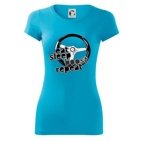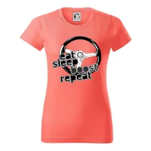 Triko pro řidiče s nápisem "Eat Sleep Boost repeat". Tohle triko za volant by měl mít každý zapálený řidič. Dárek pro automobilového závodníka.
