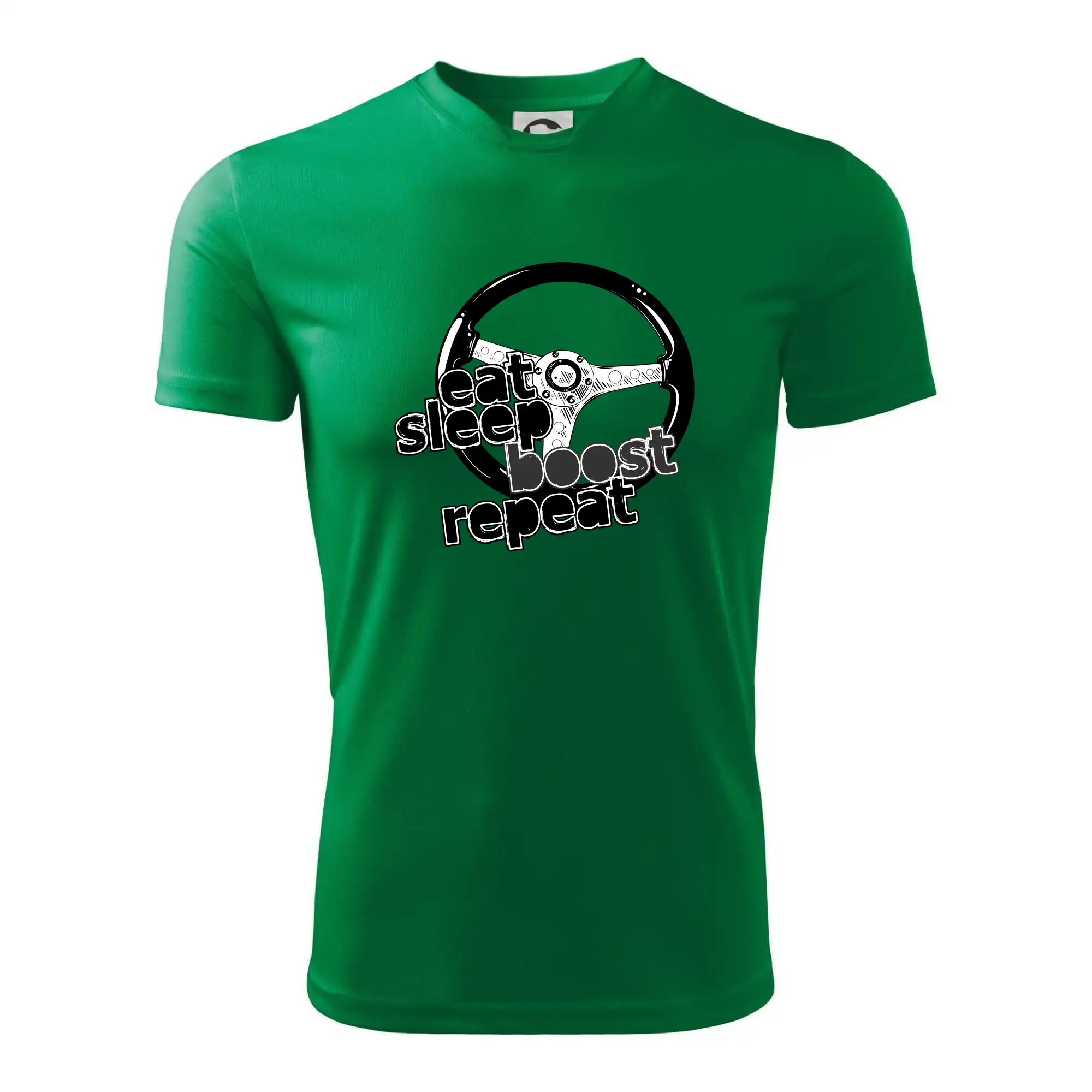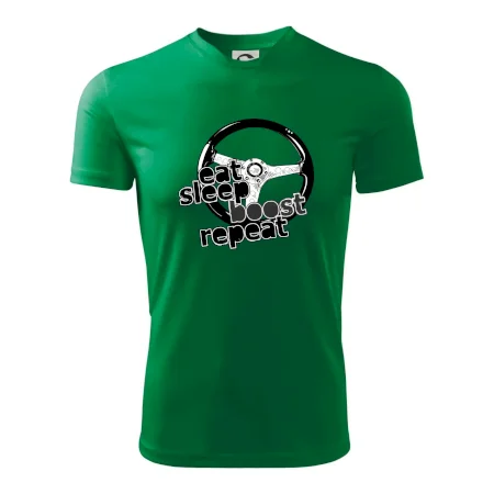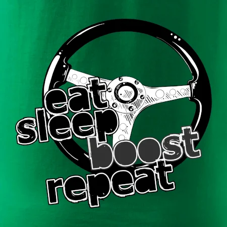 Triko pro řidiče s nápisem "Eat Sleep Boost repeat". Tohle triko za volant by měl mít každý zapálený řidič. Dárek pro automobilového závodníka.
