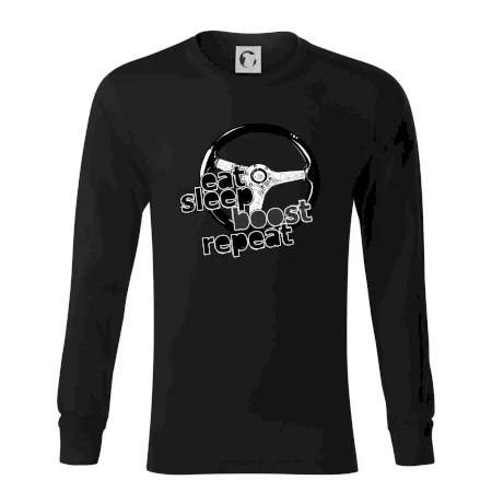 Triko pro řidiče s nápisem "Eat Sleep Boost repeat". Tohle triko za volant by měl mít každý zapálený řidič. Dárek pro automobilového závodníka.