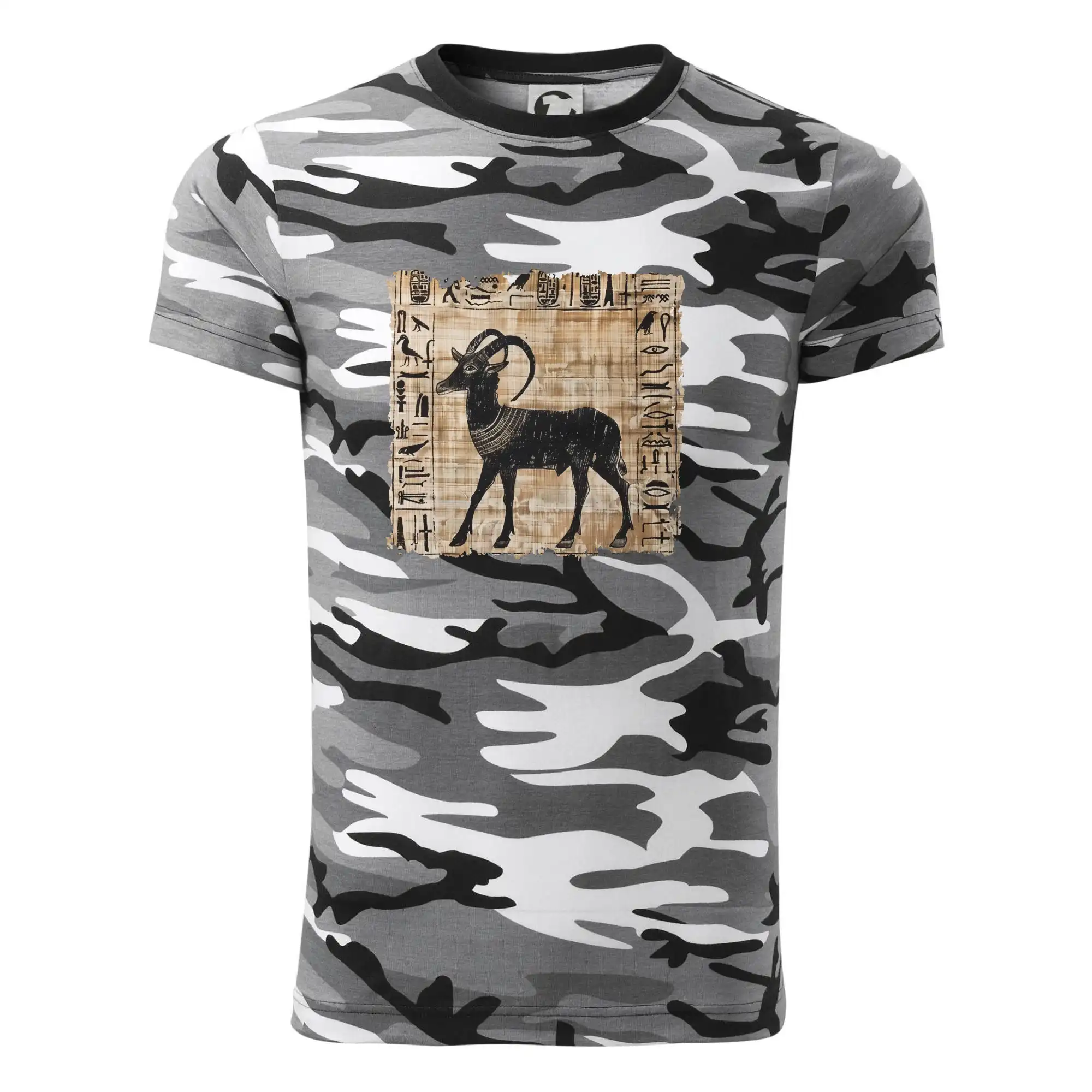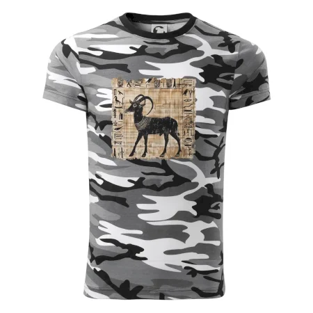 Tričko střední gramáže v barvách camouflage. Střih s bočními švy. Lem průkrčníku ze žebrového úpletu s přídavkem 5 % elastanu. Vnitřní část zadního průkrčníku začištěna páskou v barvě camouflage.