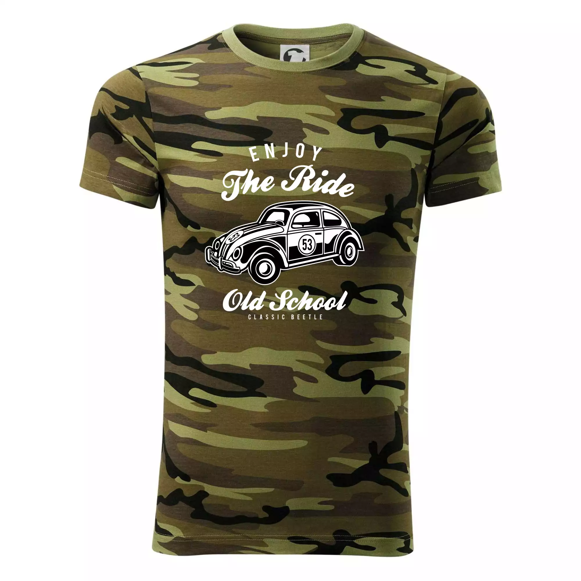 Tričko střední gramáže v barvách camouflage. Střih s bočními švy. Lem průkrčníku ze žebrového úpletu s přídavkem 5 % elastanu. Vnitřní část zadního průkrčníku začištěna páskou v barvě camouflage.