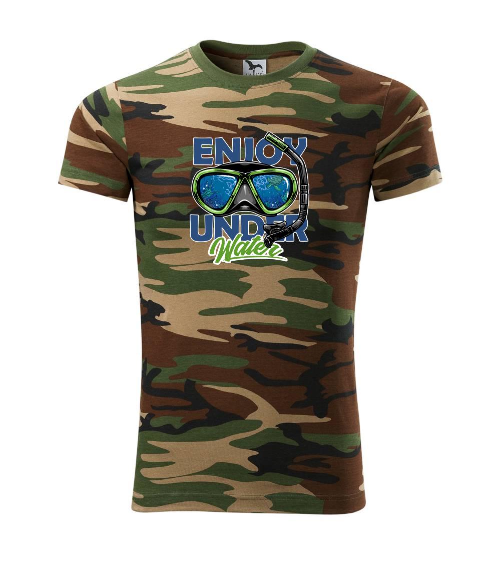 Tričko střední gramáže v barvách camouflage. Střih s bočními švy. Lem průkrčníku ze žebrového úpletu s přídavkem 5 % elastanu. Vnitřní část zadního průkrčníku začištěna páskou v barvě camouflage.