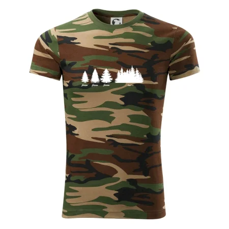 Tričko střední gramáže v barvách camouflage. Střih s bočními švy. Lem průkrčníku ze žebrového úpletu s přídavkem 5 % elastanu. Vnitřní část zadního průkrčníku začištěna páskou v barvě camouflage.