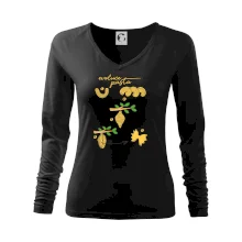Tolerantnější vypasování dámského střihu, který je vhodný pro všechny typy postavy, ideální délka rukávů a konzervativní výstřih zakončený žebrováním, které skvěle drží tvar.