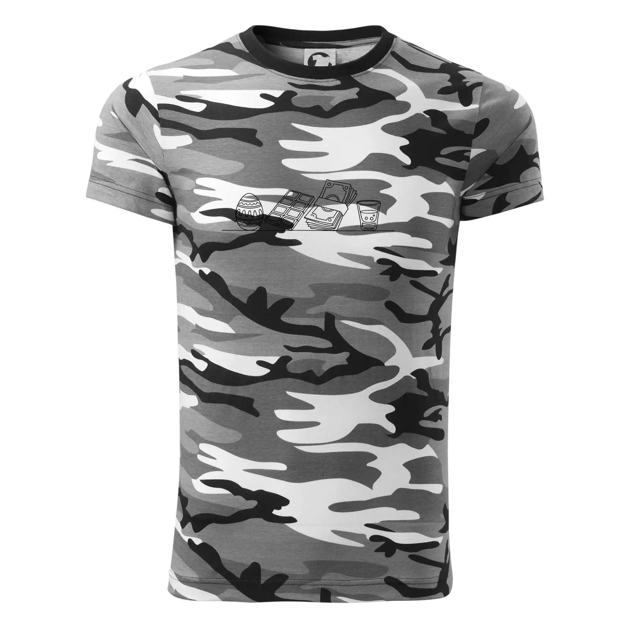 Tričko střední gramáže v barvách camouflage. Střih s bočními švy. Lem průkrčníku ze žebrového úpletu s přídavkem 5 % elastanu. Vnitřní část zadního průkrčníku začištěna páskou v barvě camouflage.