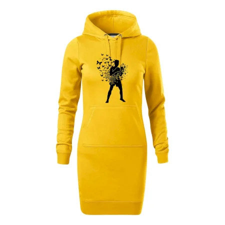 Dámské mikinové šaty MALFINI Snap 419 jsou ideální volbou pro ženy, které hledají pohodlný a stylový kousek pro volný čas nebo každodenní nošení. Lehce vypasovaný střih s bočními švy podtrhuje ženskou siluetu, zatímco kapuce s podšívkou a stahovací šňůrkou dodává ležérní vzhled. Šaty mají délku nad kolena a jsou vybaveny nakládanou kapsou ve stylu „klokanky“. Materiál je měkký a příjemný na dotek díky směsi bavlny a polyesteru s nepočesanou vnitřní stranou.