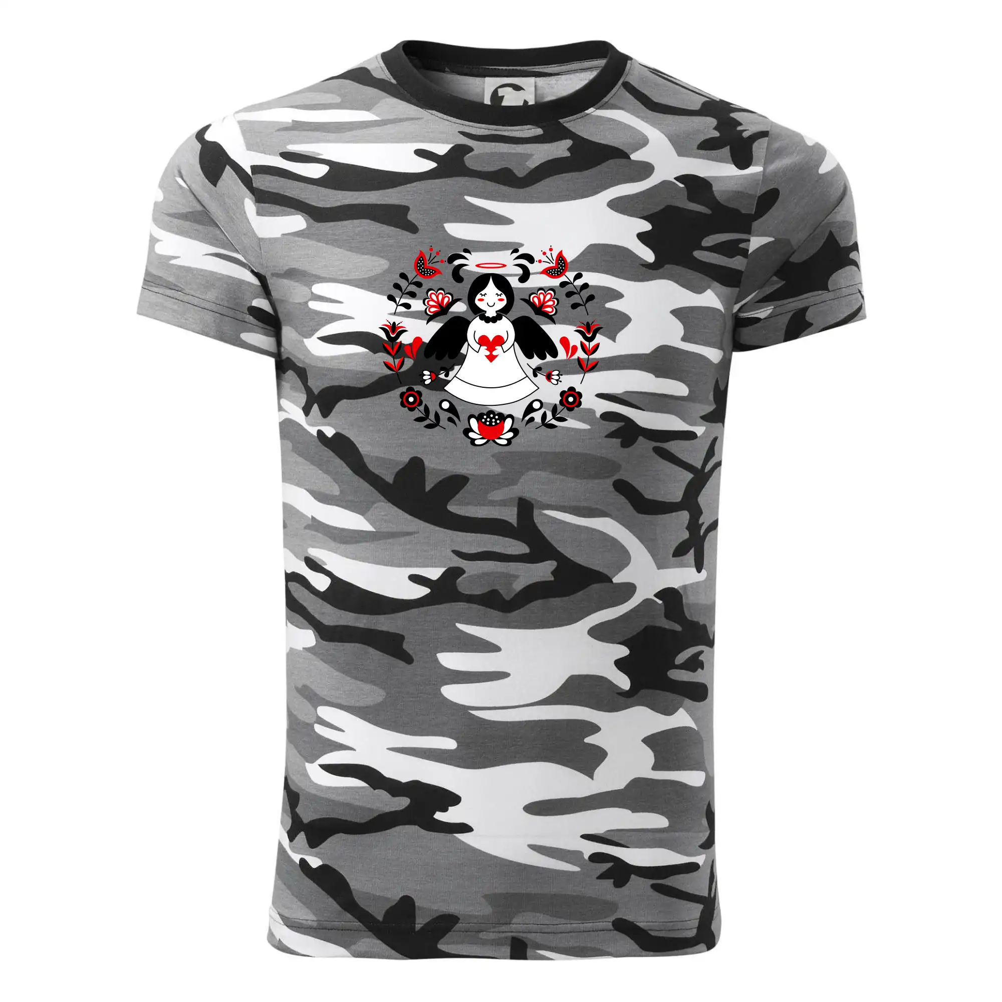 Tričko střední gramáže v barvách camouflage. Střih s bočními švy. Lem průkrčníku ze žebrového úpletu s přídavkem 5 % elastanu. Vnitřní část zadního průkrčníku začištěna páskou v barvě camouflage.