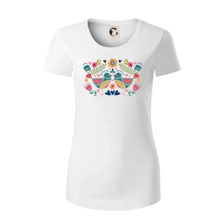 Motiv trička vychází z tradičních folklorních prvků: Na středu jsou dva výrazní a barevní ptáčci, stylizovaní v lidovém ornamentu. Design je doplněn decentními rostlinnými ornamenty a jemnou liniovou grafikou, která symbolizuje přírodu a český venkov. Barevné provedení přináší radost, energii a pocit tradice zároveň.