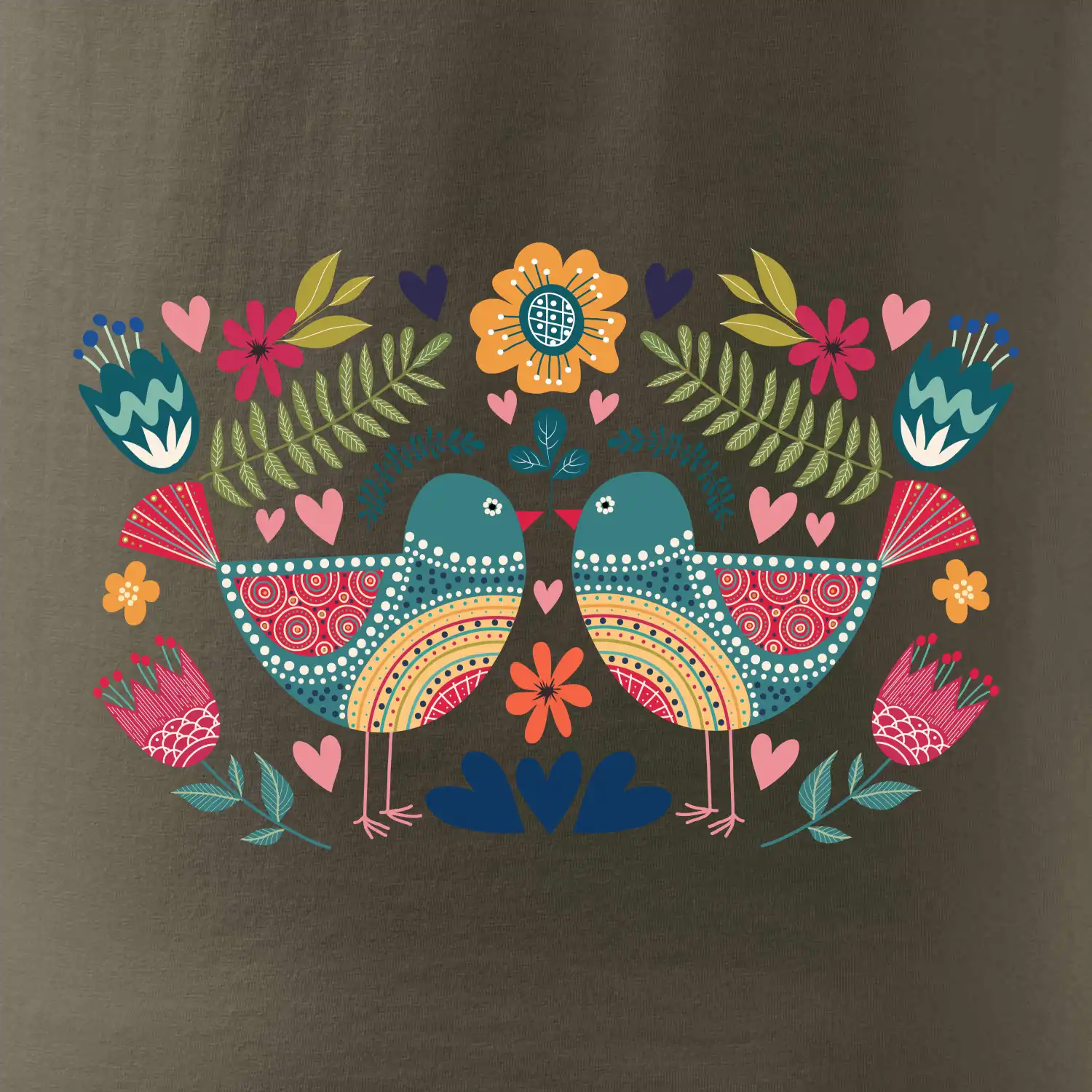 - Folklorní motiv ptáčků – potěší milovníky tradice, přírody i barevné grafiky.