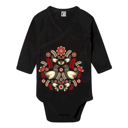 Elegantní folklórní motiv inspirovaný tradiční výšivkou, který přináší krásu venkova na moderní kousek oblečení. Hnědí ptáčci, květy a listy v harmonickém kruhu vytvářejí symbol lásky, přírody a života v rovnováze.