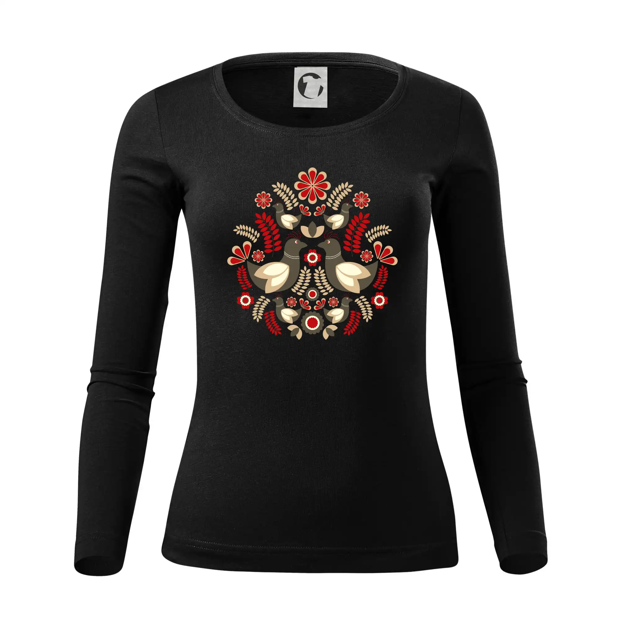 Elegantní folklórní motiv inspirovaný tradiční výšivkou, který přináší krásu venkova na moderní kousek oblečení. Hnědí ptáčci, květy a listy v harmonickém kruhu vytvářejí symbol lásky, přírody a života v rovnováze.