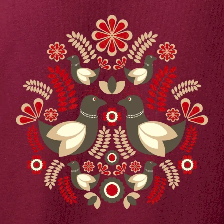 Elegantní folklórní motiv inspirovaný tradiční výšivkou, který přináší krásu venkova na moderní kousek oblečení. Hnědí ptáčci, květy a listy v harmonickém kruhu vytvářejí symbol lásky, přírody a života v rovnováze.