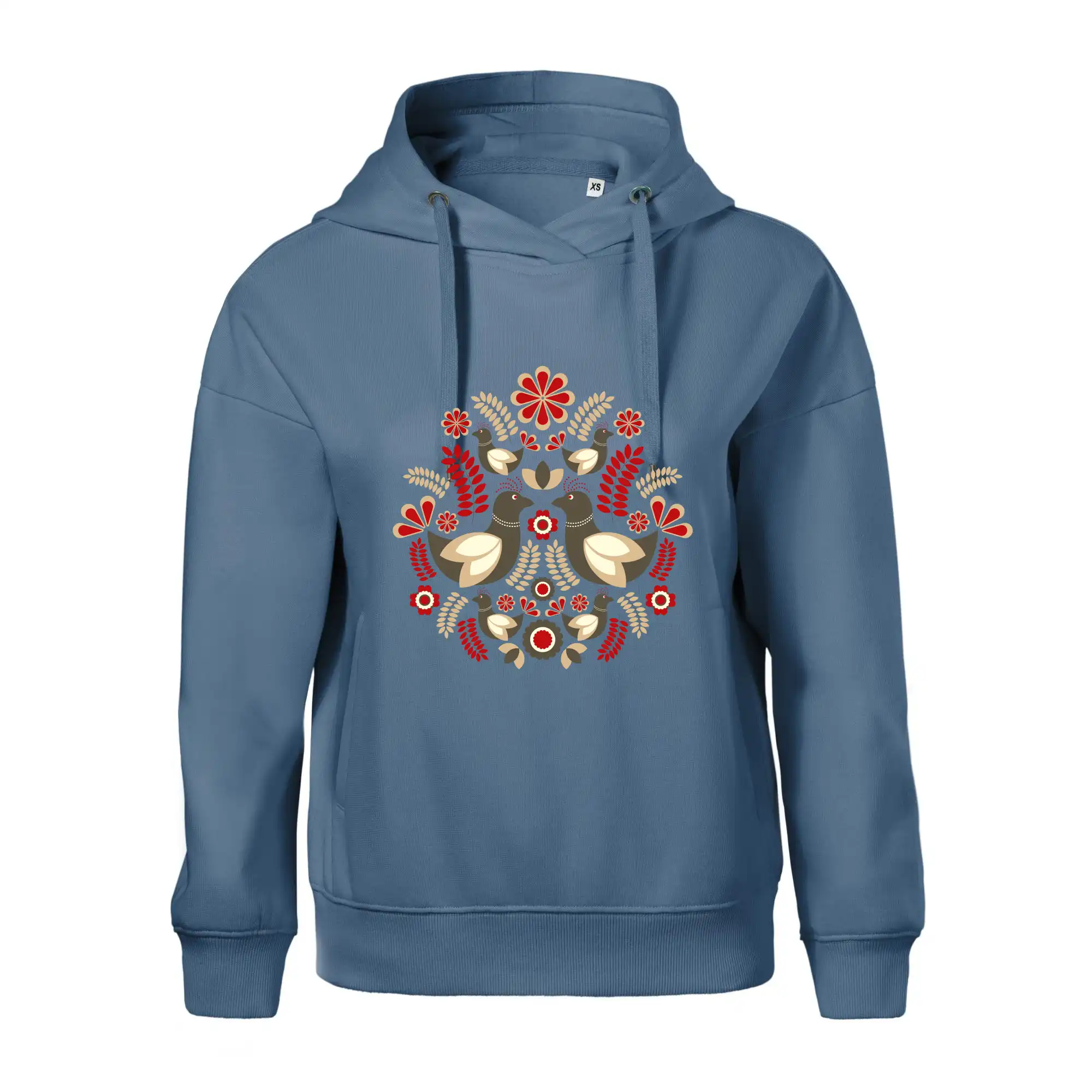 Elegantní folklórní motiv inspirovaný tradiční výšivkou, který přináší krásu venkova na moderní kousek oblečení. Hnědí ptáčci, květy a listy v harmonickém kruhu vytvářejí symbol lásky, přírody a života v rovnováze.