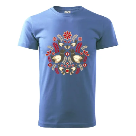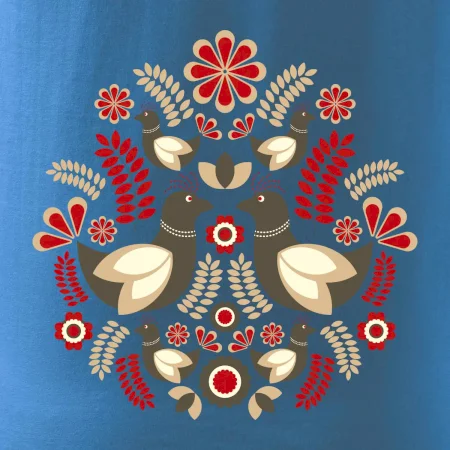 Elegantní folklórní motiv inspirovaný tradiční výšivkou, který přináší krásu venkova na moderní kousek oblečení. Hnědí ptáčci, květy a listy v harmonickém kruhu vytvářejí symbol lásky, přírody a života v rovnováze.
