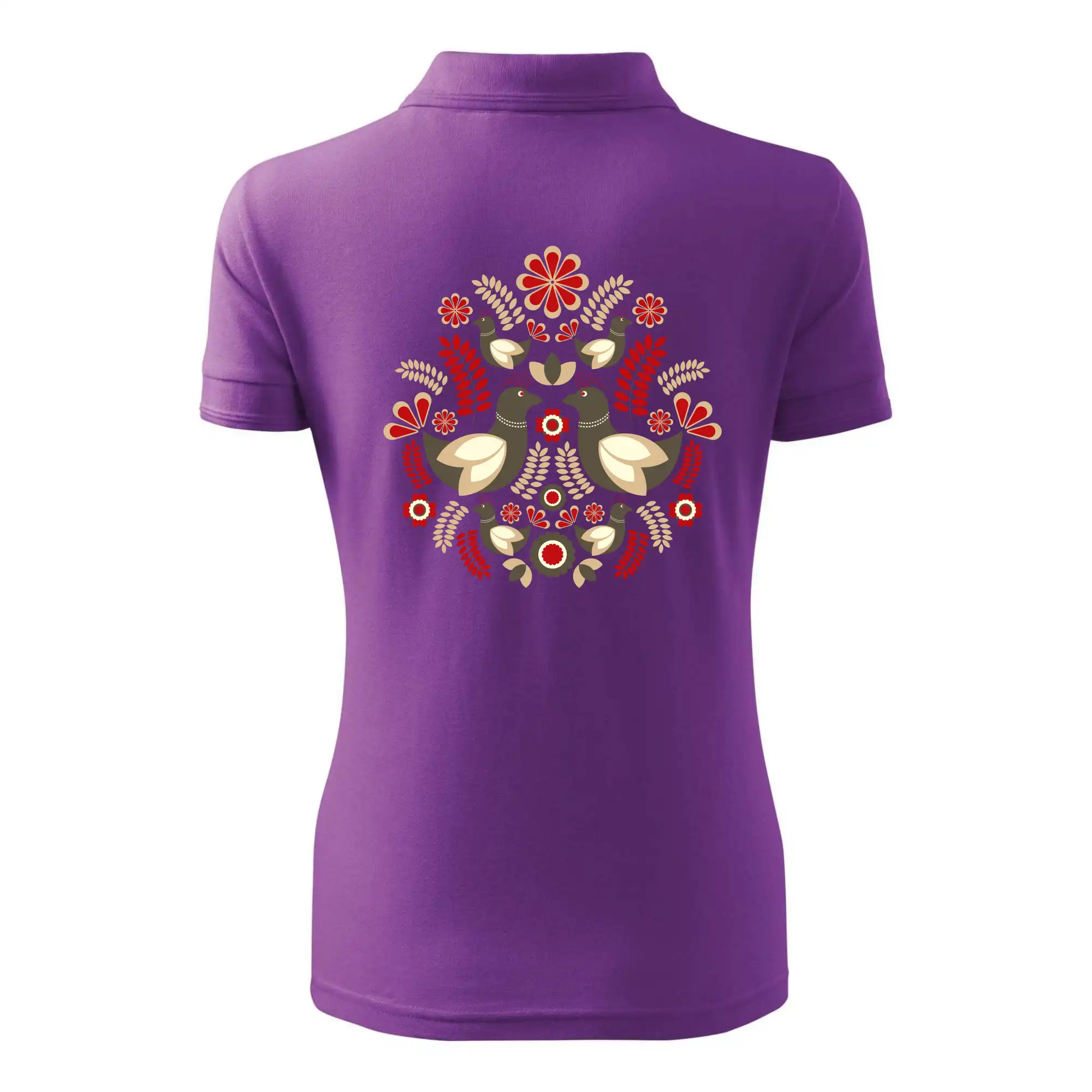 Elegantní folklórní motiv inspirovaný tradiční výšivkou, který přináší krásu venkova na moderní kousek oblečení. Hnědí ptáčci, květy a listy v harmonickém kruhu vytvářejí symbol lásky, přírody a života v rovnováze.