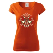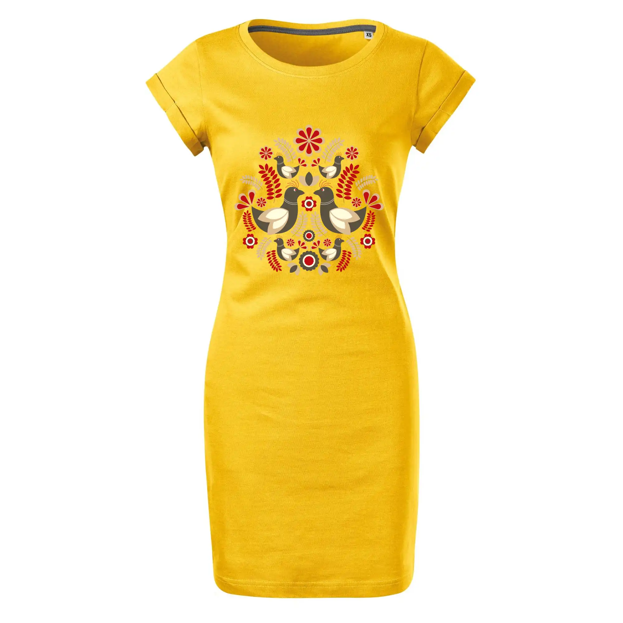 Elegantní folklórní motiv inspirovaný tradiční výšivkou, který přináší krásu venkova na moderní kousek oblečení. Hnědí ptáčci, květy a listy v harmonickém kruhu vytvářejí symbol lásky, přírody a života v rovnováze.