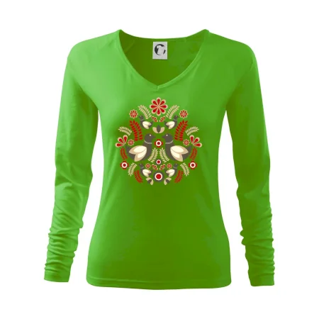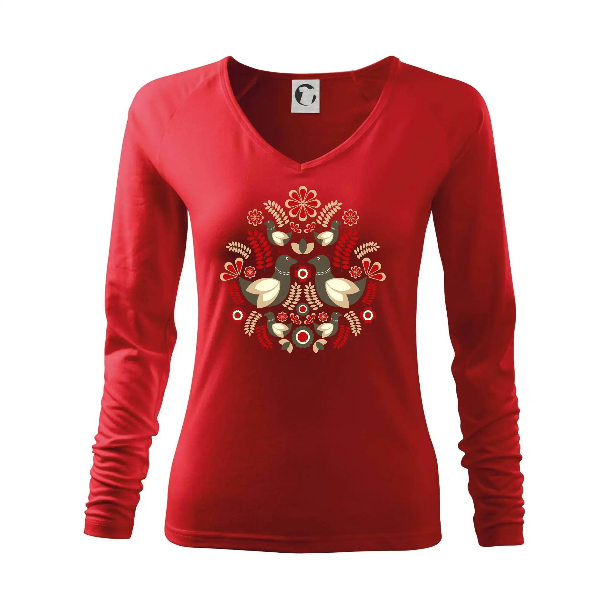 Elegantní folklórní motiv inspirovaný tradiční výšivkou, který přináší krásu venkova na moderní kousek oblečení. Hnědí ptáčci, květy a listy v harmonickém kruhu vytvářejí symbol lásky, přírody a života v rovnováze.