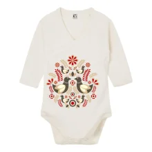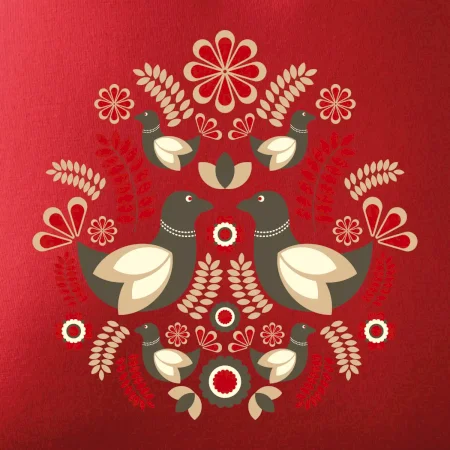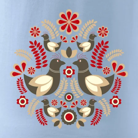 Elegantní folklórní motiv inspirovaný tradiční výšivkou, který přináší krásu venkova na moderní kousek oblečení. Hnědí ptáčci, květy a listy v harmonickém kruhu vytvářejí symbol lásky, přírody a života v rovnováze.