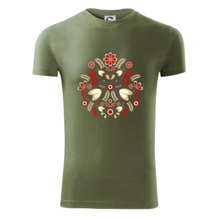 Elegantní folklórní motiv inspirovaný tradiční výšivkou, který přináší krásu venkova na moderní kousek oblečení. Hnědí ptáčci, květy a listy v harmonickém kruhu vytvářejí symbol lásky, přírody a života v rovnováze.