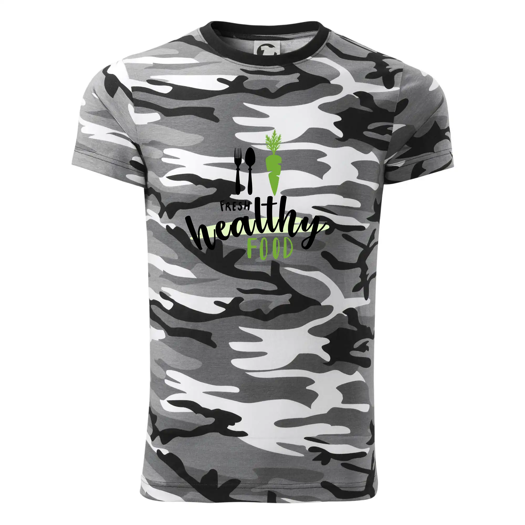 Tričko střední gramáže v barvách camouflage. Střih s bočními švy. Lem průkrčníku ze žebrového úpletu s přídavkem 5 % elastanu. Vnitřní část zadního průkrčníku začištěna páskou v barvě camouflage.
