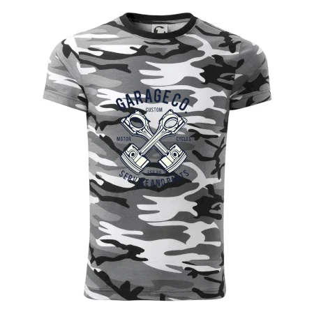 Tričko střední gramáže v barvách camouflage. Střih s bočními švy. Lem průkrčníku ze žebrového úpletu s přídavkem 5 % elastanu. Vnitřní část zadního průkrčníku začištěna páskou v barvě camouflage.