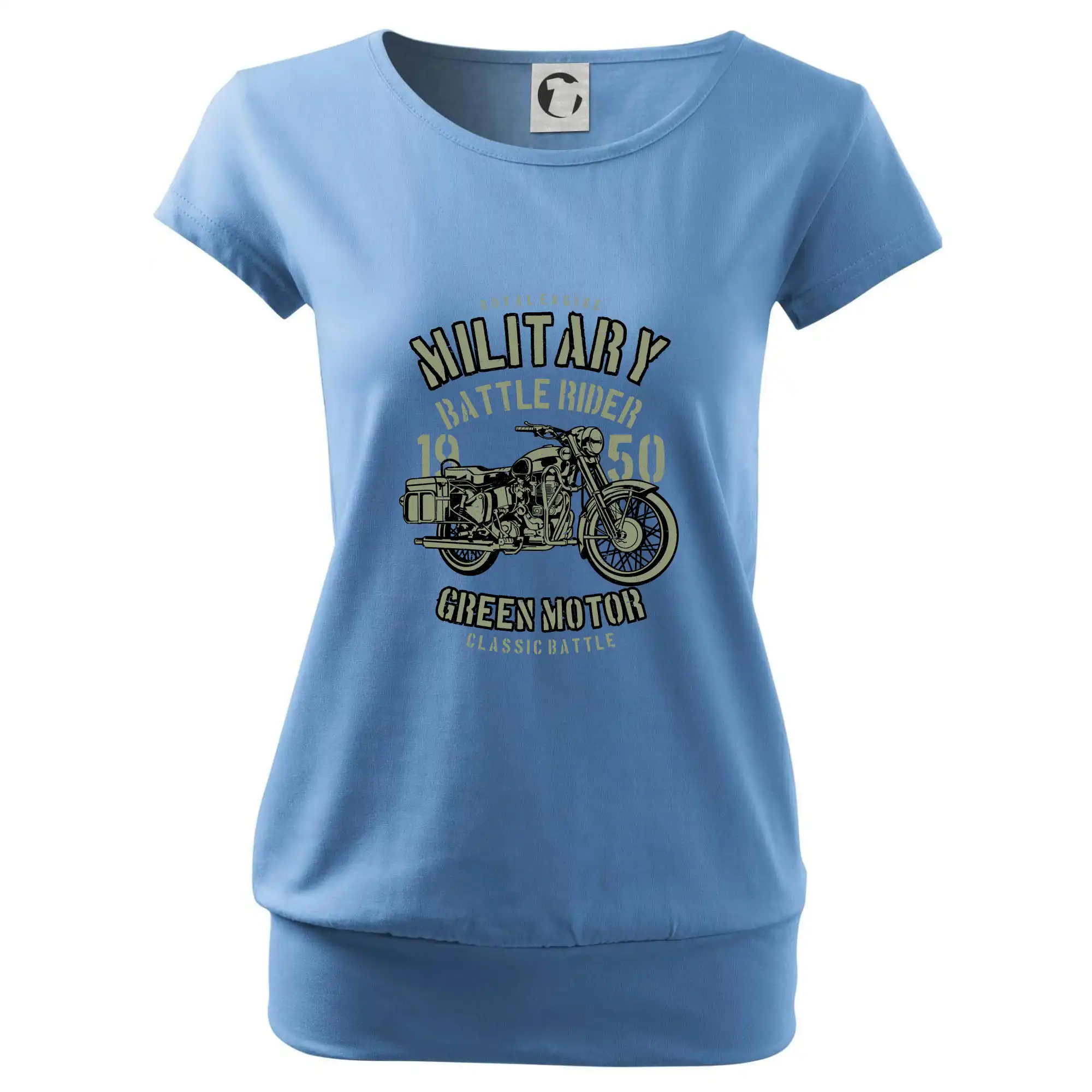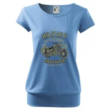 Trendové dámské triko s velmi krátkým rukávem, volnějšího střihu, v dolním kraji všité do širokého lemu. Kulatý průkrčník s úzkým lemem ze shodného materiálu.