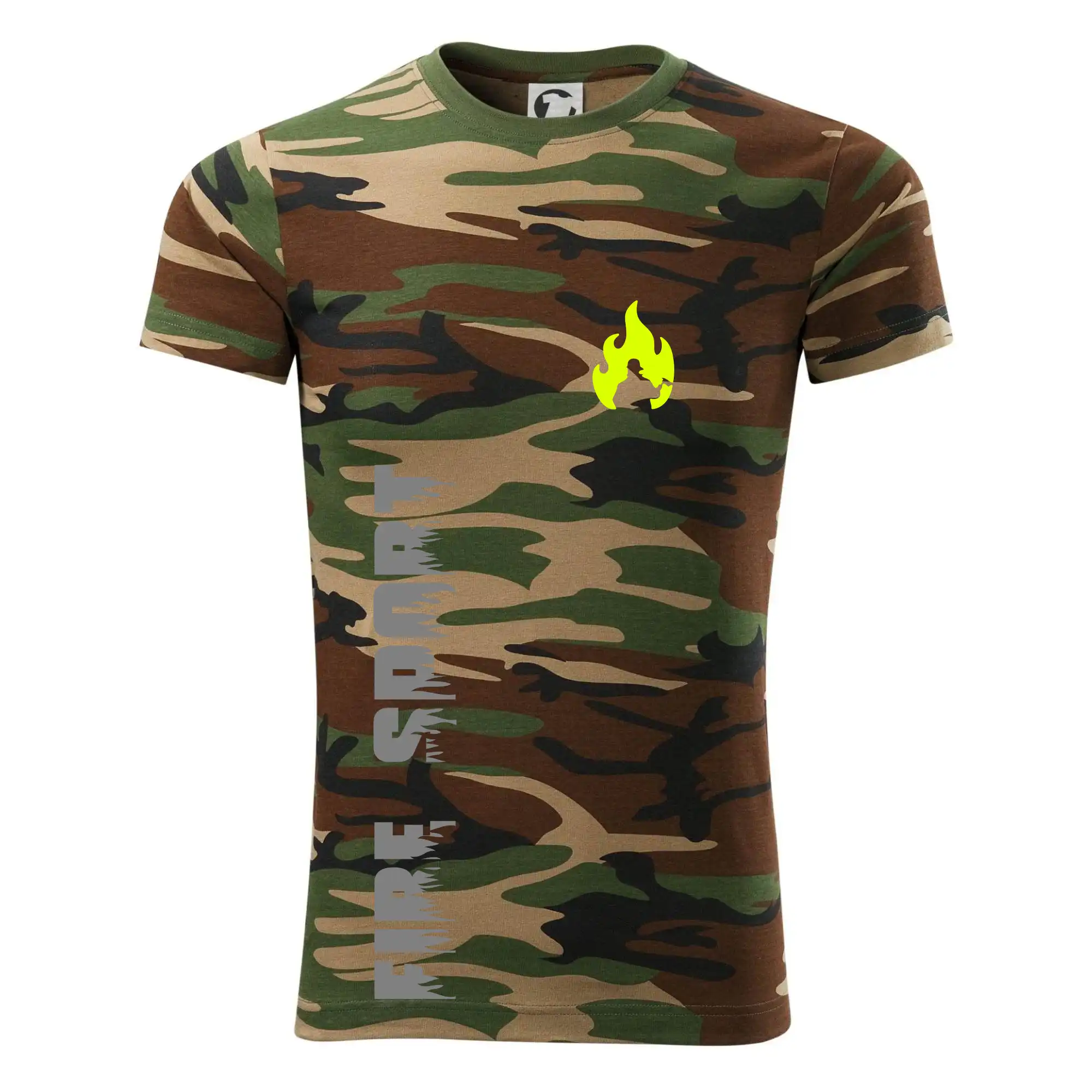 Tričko střední gramáže v barvách camouflage. Střih s bočními švy. Lem průkrčníku ze žebrového úpletu s přídavkem 5 % elastanu. Vnitřní část zadního průkrčníku začištěna páskou v barvě camouflage.