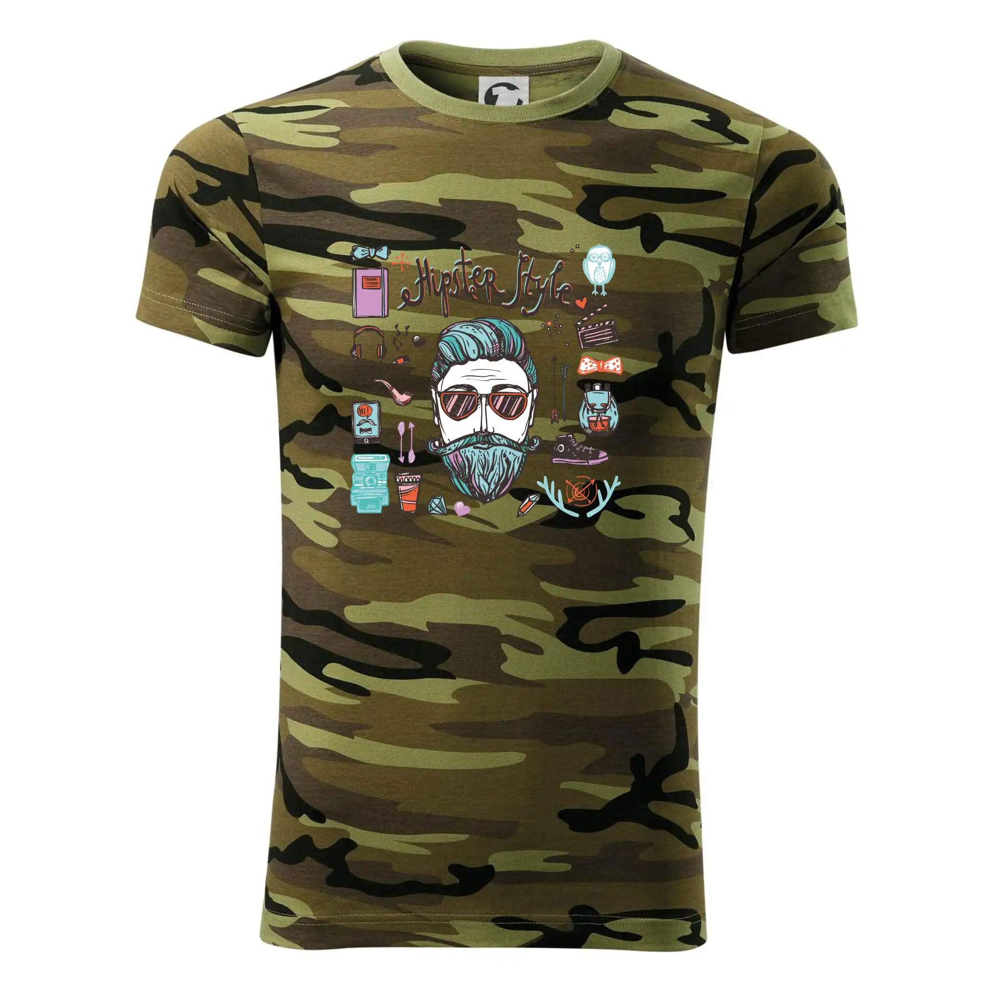 Tričko střední gramáže v barvách camouflage. Střih s bočními švy. Lem průkrčníku ze žebrového úpletu s přídavkem 5 % elastanu. Vnitřní část zadního průkrčníku začištěna páskou v barvě camouflage.