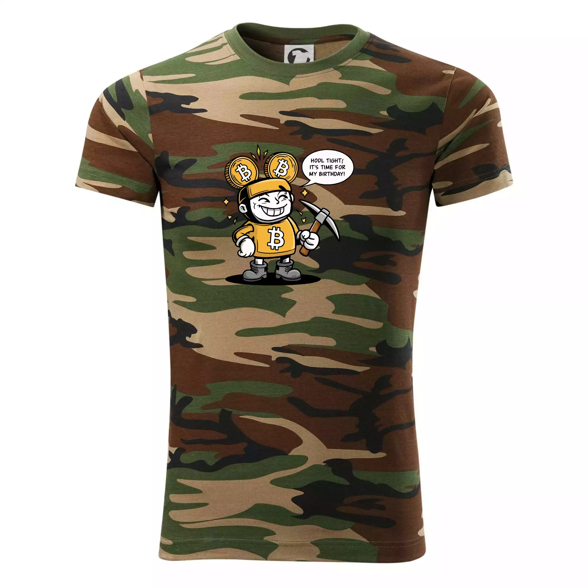 Tričko střední gramáže v barvách camouflage. Střih s bočními švy. Lem průkrčníku ze žebrového úpletu s přídavkem 5 % elastanu. Vnitřní část zadního průkrčníku začištěna páskou v barvě camouflage.