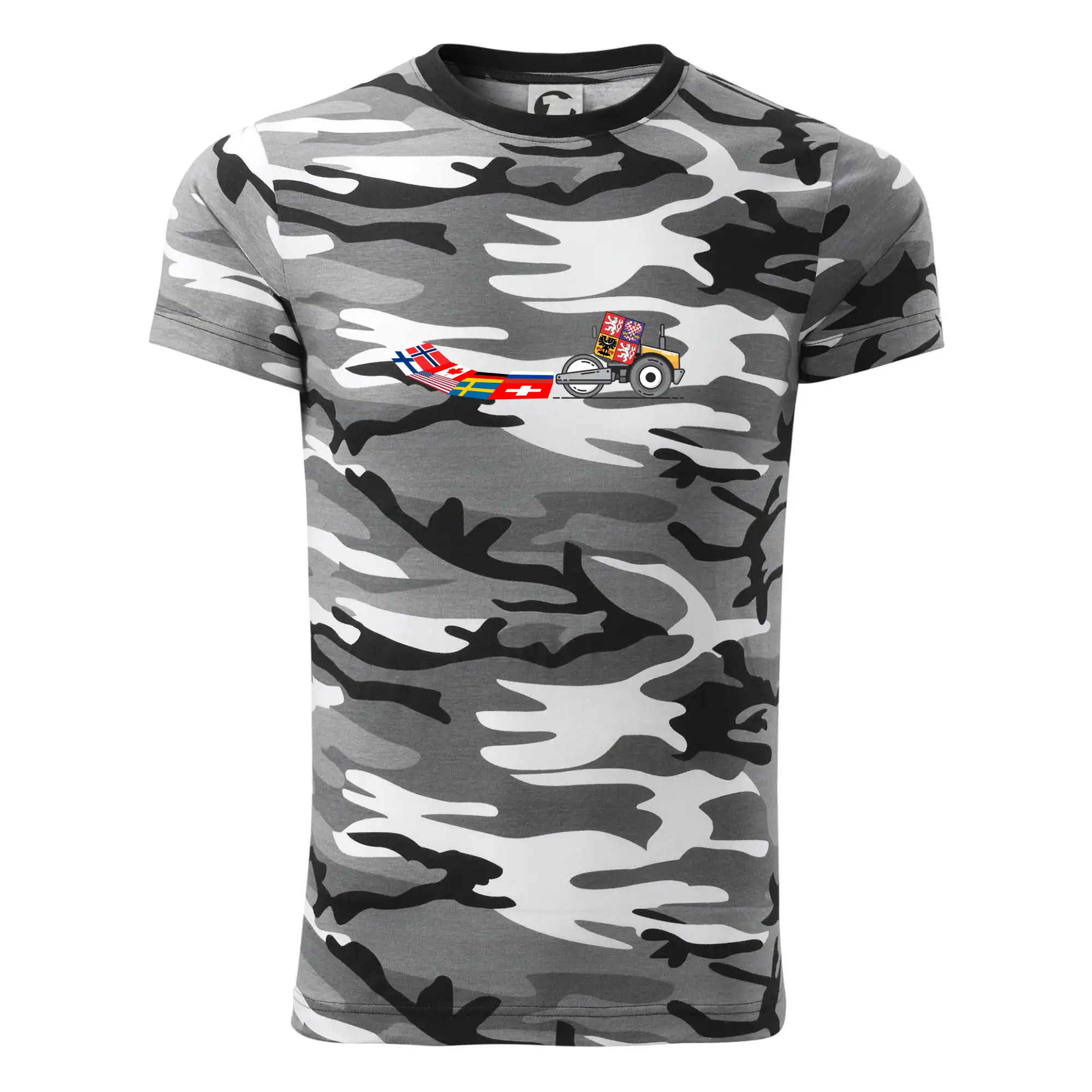 Tričko střední gramáže v barvách camouflage. Střih s bočními švy. Lem průkrčníku ze žebrového úpletu s přídavkem 5 % elastanu. Vnitřní část zadního průkrčníku začištěna páskou v barvě camouflage.