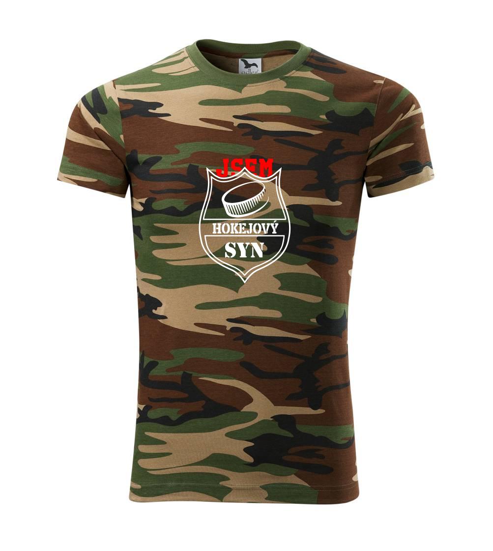 Tričko střední gramáže v barvách camouflage. Střih s bočními švy. Lem průkrčníku ze žebrového úpletu s přídavkem 5 % elastanu. Vnitřní část zadního průkrčníku začištěna páskou v barvě camouflage.