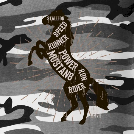 Tričko střední gramáže v barvách camouflage. Střih s bočními švy. Lem průkrčníku ze žebrového úpletu s přídavkem 5 % elastanu. Vnitřní část zadního průkrčníku začištěna páskou v barvě camouflage.