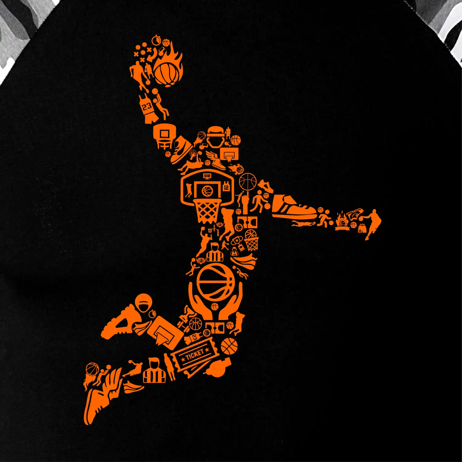 Triko s basketbalovým hráčem vytvořeným z typických basketbalových ikon, které jsou typické pro tuto míčovou hru. Perfektní dárek pro basketbalistu, basketbalista na triku.