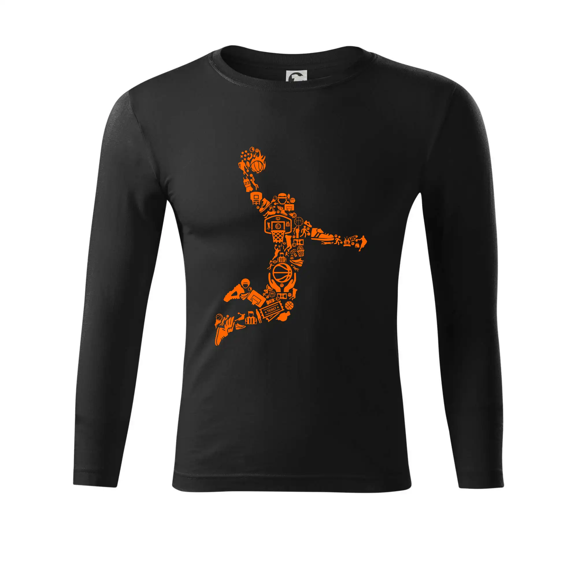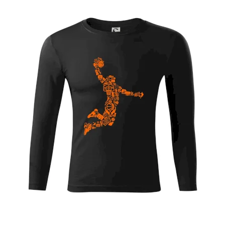 Triko s basketbalovým hráčem vytvořeným z typických basketbalových ikon, které jsou typické pro tuto míčovou hru. Perfektní dárek pro basketbalistu, basketbalista na triku.