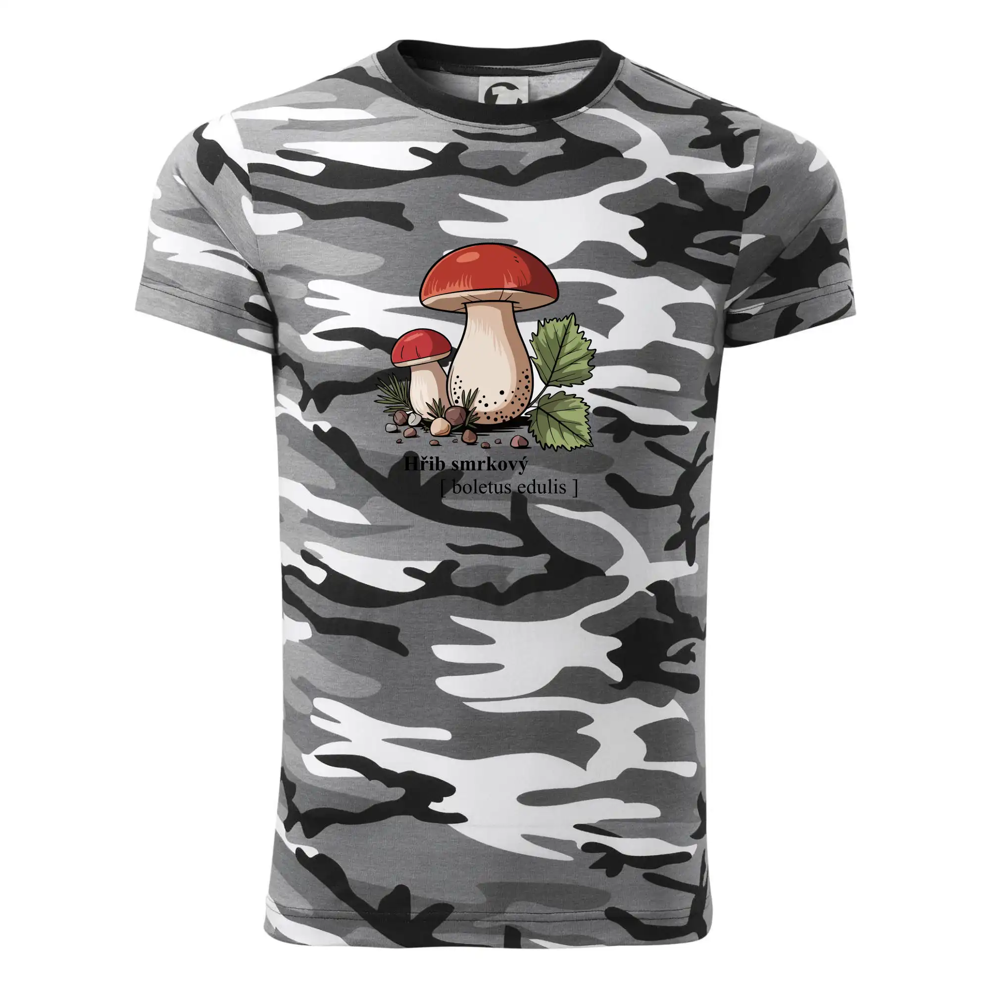 Tričko střední gramáže v barvách camouflage. Střih s bočními švy. Lem průkrčníku ze žebrového úpletu s přídavkem 5 % elastanu. Vnitřní část zadního průkrčníku začištěna páskou v barvě camouflage.