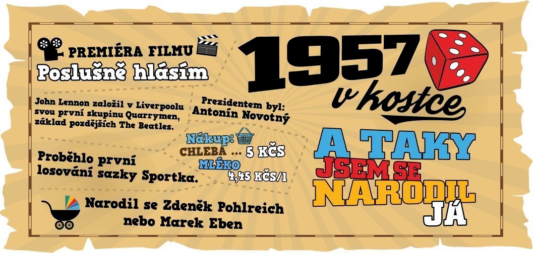 V naší nabídce najdete tento potisk 1957 v kostce pro muže i na tričko.