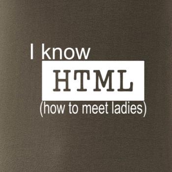 Tričko s potiskem "I know HTML" pro programátora webových stránek je skvělým dárkem pro kamaráda či kamarádku. Mrkni na další programátorská trika, geek trika nebo trička s periodickou tabulkou.