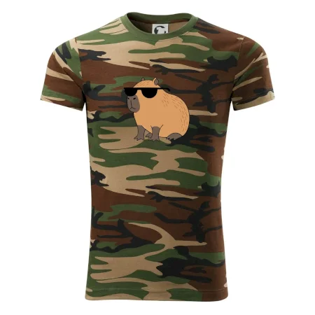 Tričko střední gramáže v barvách camouflage. Střih s bočními švy. Lem průkrčníku ze žebrového úpletu s přídavkem 5 % elastanu. Vnitřní část zadního průkrčníku začištěna páskou v barvě camouflage.