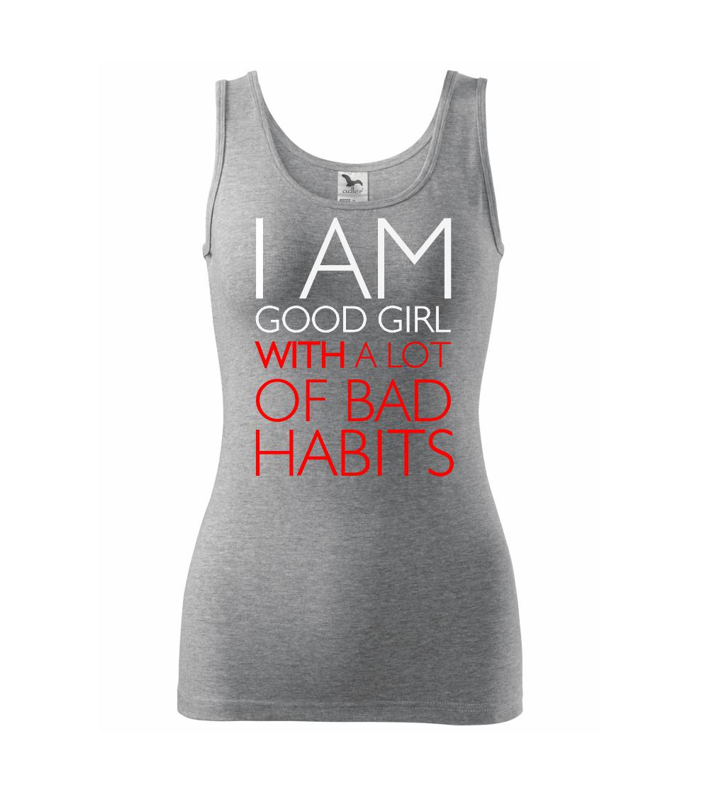 Vtipné triko pro holku. Jsi taky hodná holka se spoustou špatných zvyků? Pak je tohle triko přímo pro tebe. Vtipný dárek pro holku. Triko s nápisem "I am a good girl with a lot of bad habbits."