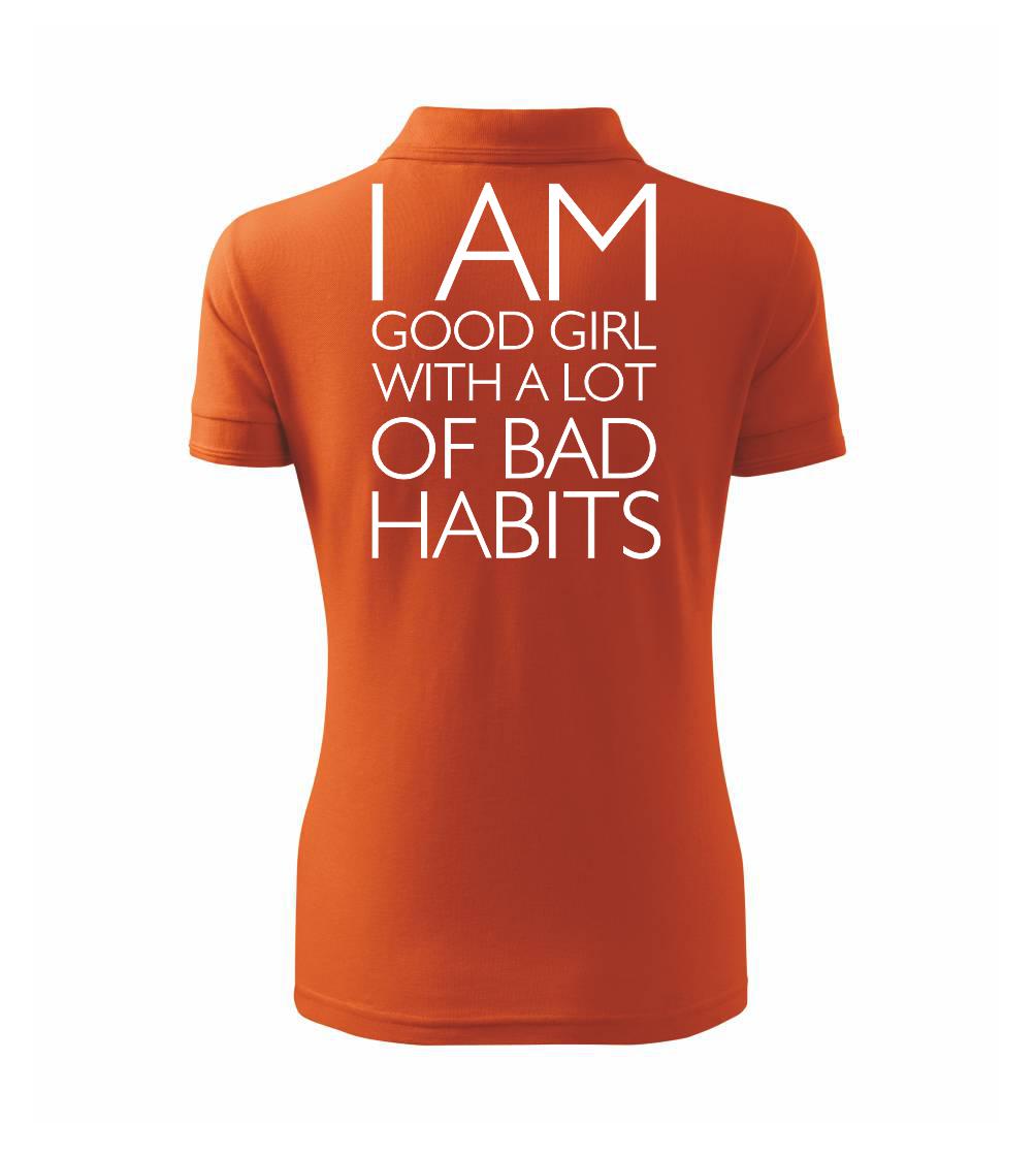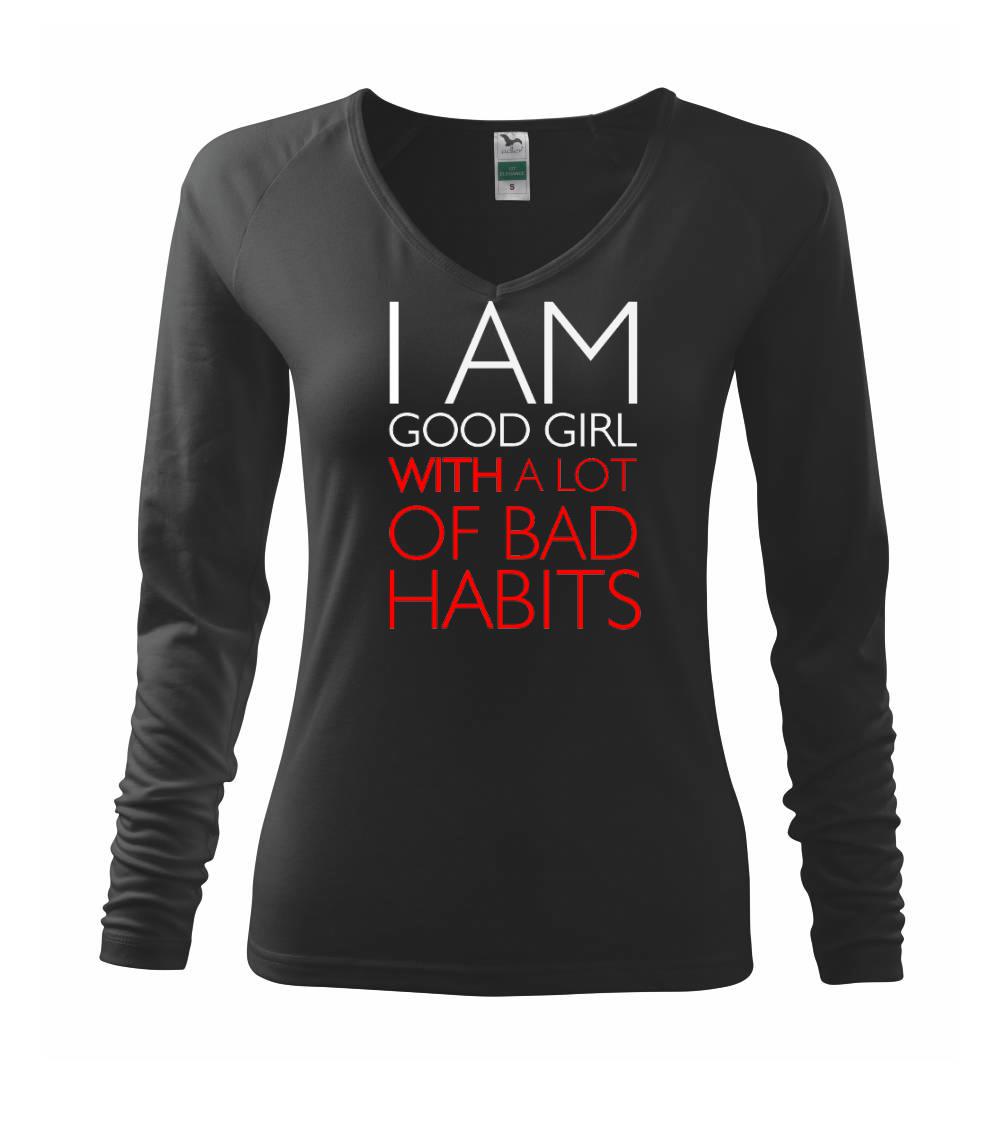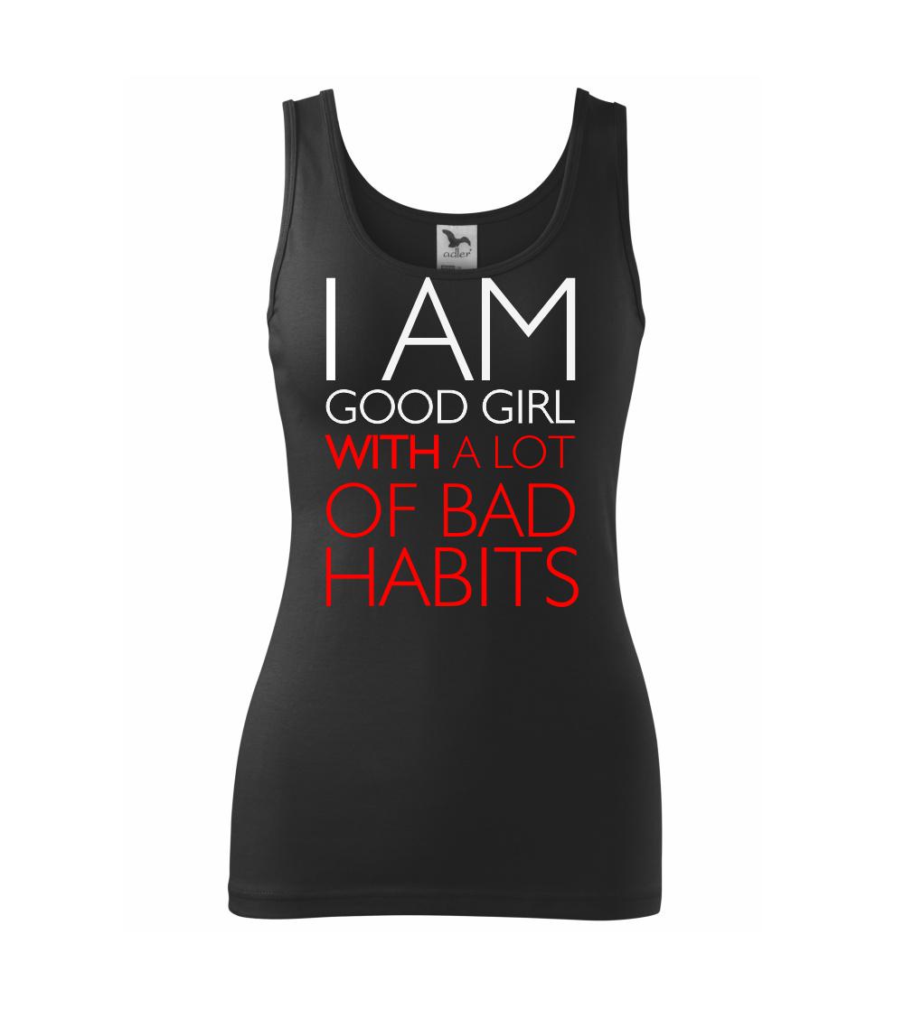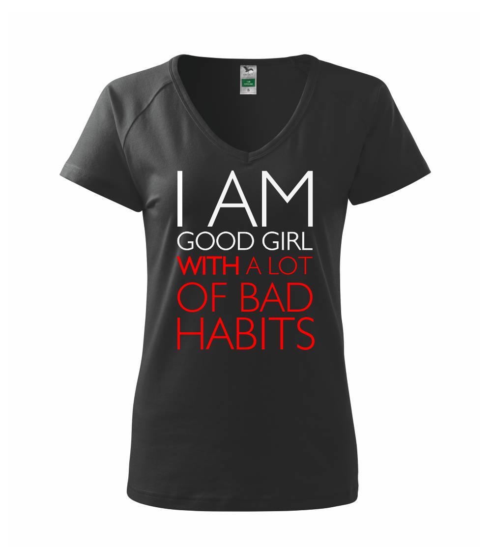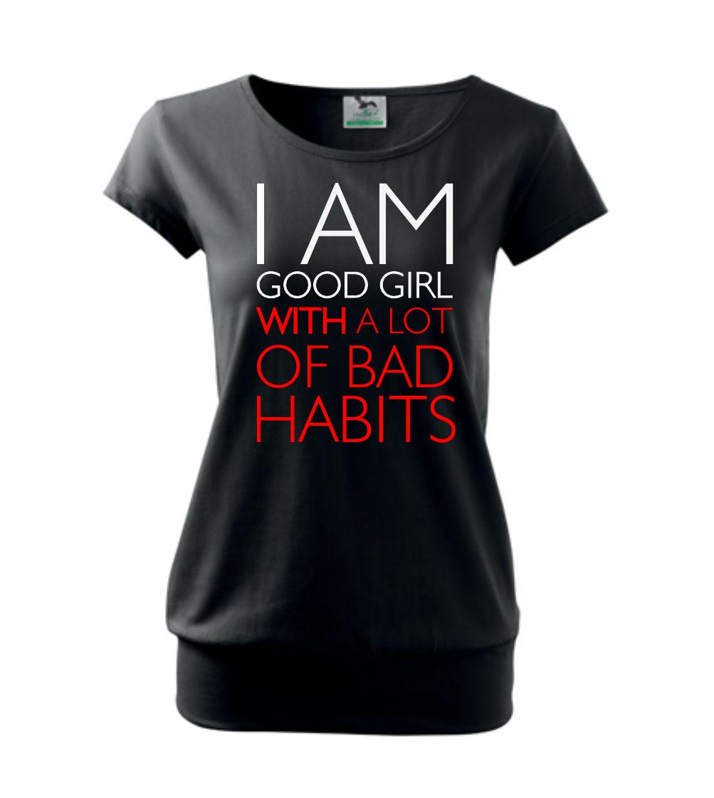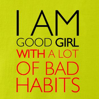 Vtipné triko pro holku. Jsi taky hodná holka se spoustou špatných zvyků? Pak je tohle triko přímo pro tebe. Vtipný dárek pro holku. Triko s nápisem "I am a good girl with a lot of bad habbits."