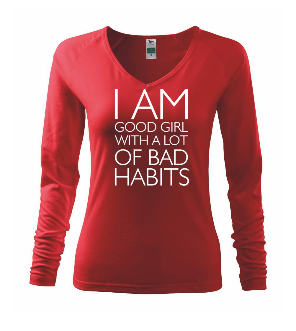 Vtipné triko pro holku. Jsi taky hodná holka se spoustou špatných zvyků? Pak je tohle triko přímo pro tebe. Vtipný dárek pro holku. Triko s nápisem "I am a good girl with a lot of bad habbits."