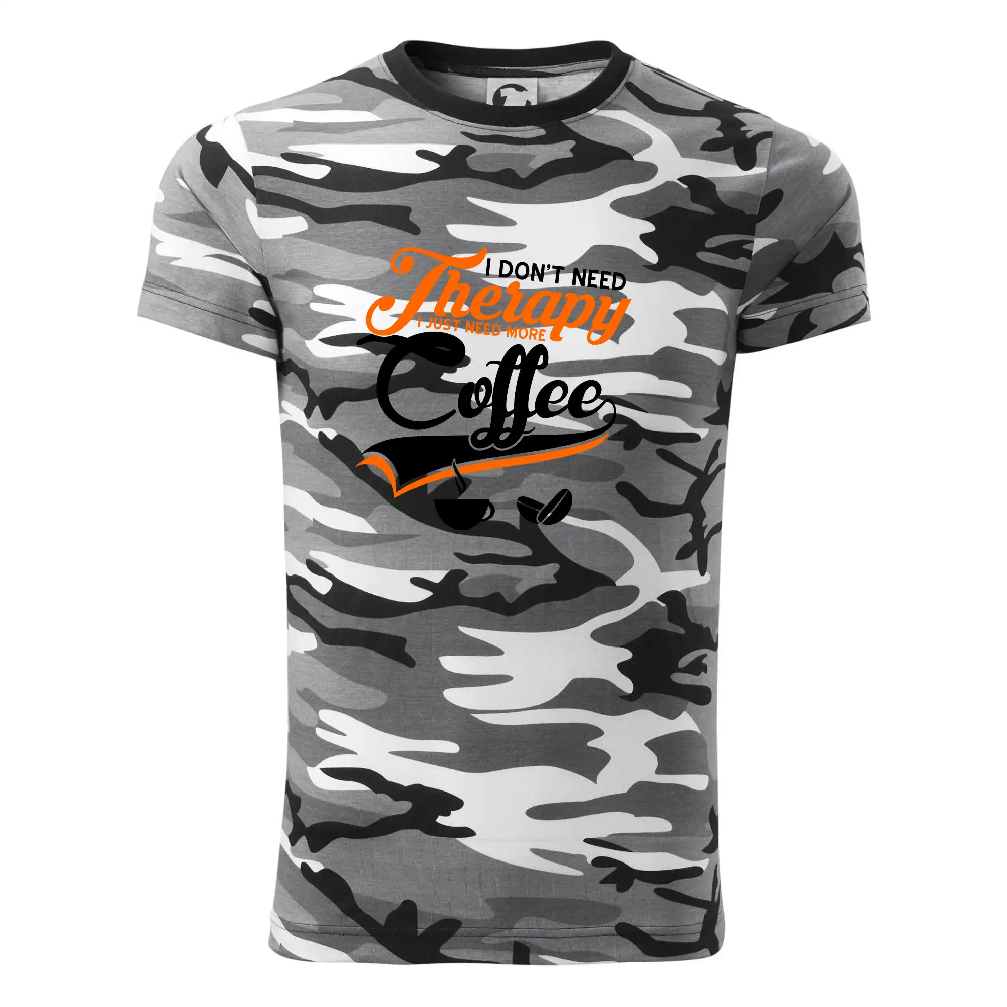 Tričko střední gramáže v barvách camouflage. Střih s bočními švy. Lem průkrčníku ze žebrového úpletu s přídavkem 5 % elastanu. Vnitřní část zadního průkrčníku začištěna páskou v barvě camouflage.