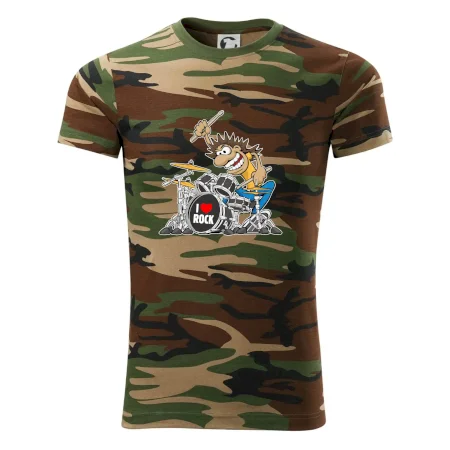 Tričko střední gramáže v barvách camouflage. Střih s bočními švy. Lem průkrčníku ze žebrového úpletu s přídavkem 5 % elastanu. Vnitřní část zadního průkrčníku začištěna páskou v barvě camouflage.