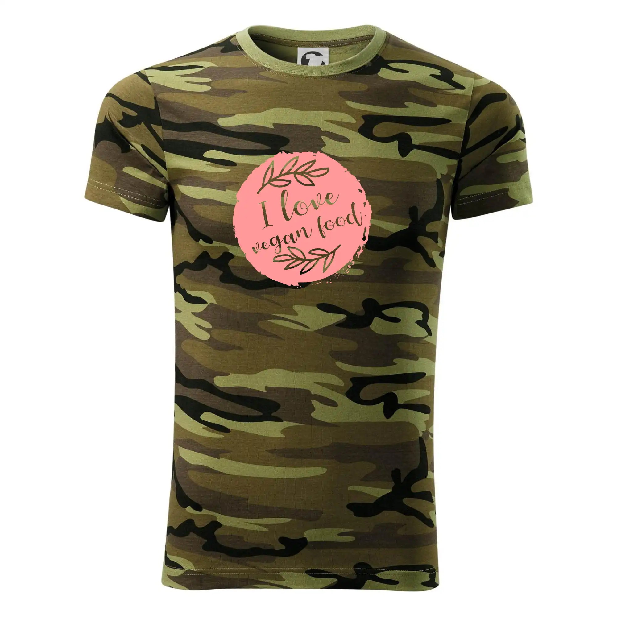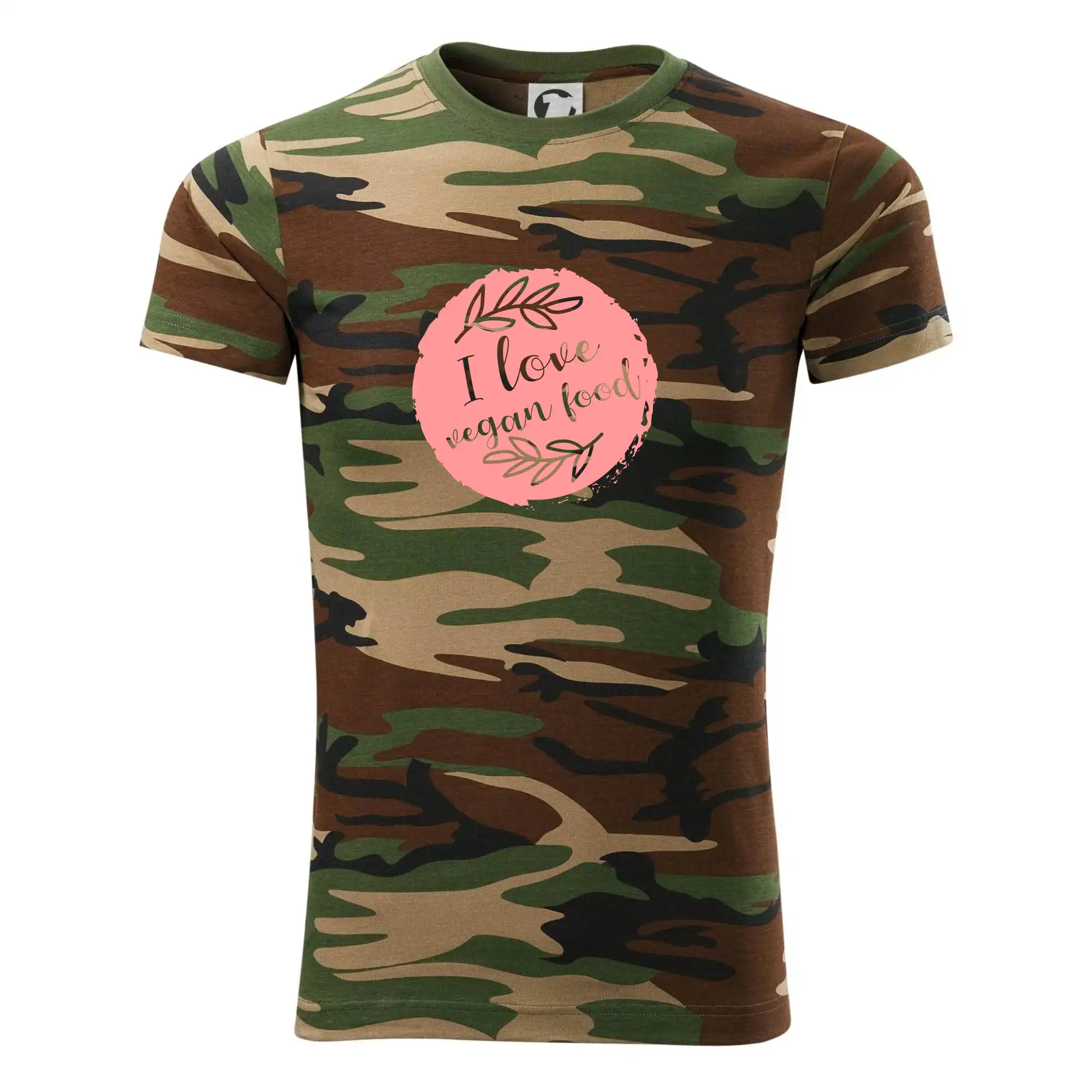 Tričko střední gramáže v barvách camouflage. Střih s bočními švy. Lem průkrčníku ze žebrového úpletu s přídavkem 5 % elastanu. Vnitřní část zadního průkrčníku začištěna páskou v barvě camouflage.