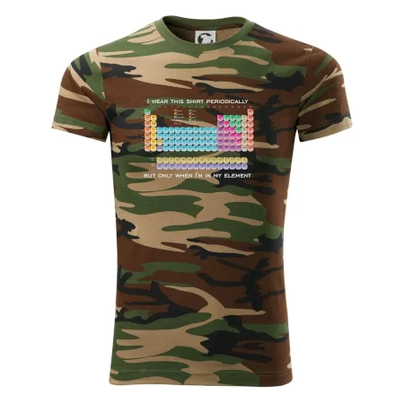 Tričko střední gramáže v barvách camouflage. Střih s bočními švy. Lem průkrčníku ze žebrového úpletu s přídavkem 5 % elastanu. Vnitřní část zadního průkrčníku začištěna páskou v barvě camouflage.