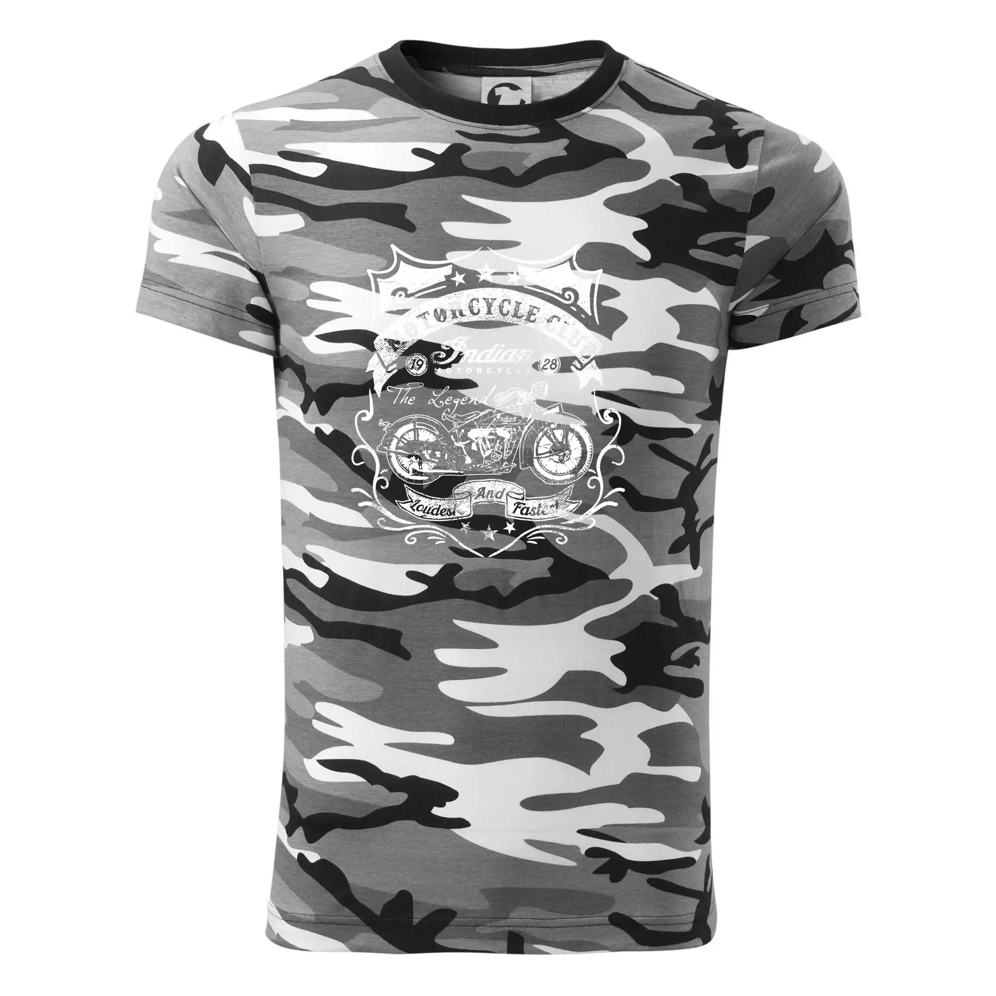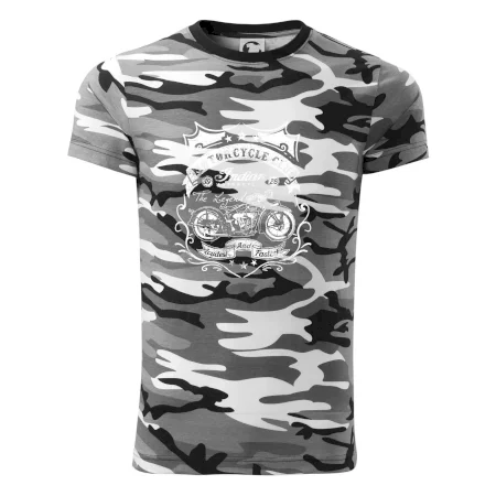 Tričko střední gramáže v barvách camouflage. Střih s bočními švy. Lem průkrčníku ze žebrového úpletu s přídavkem 5 % elastanu. Vnitřní část zadního průkrčníku začištěna páskou v barvě camouflage.