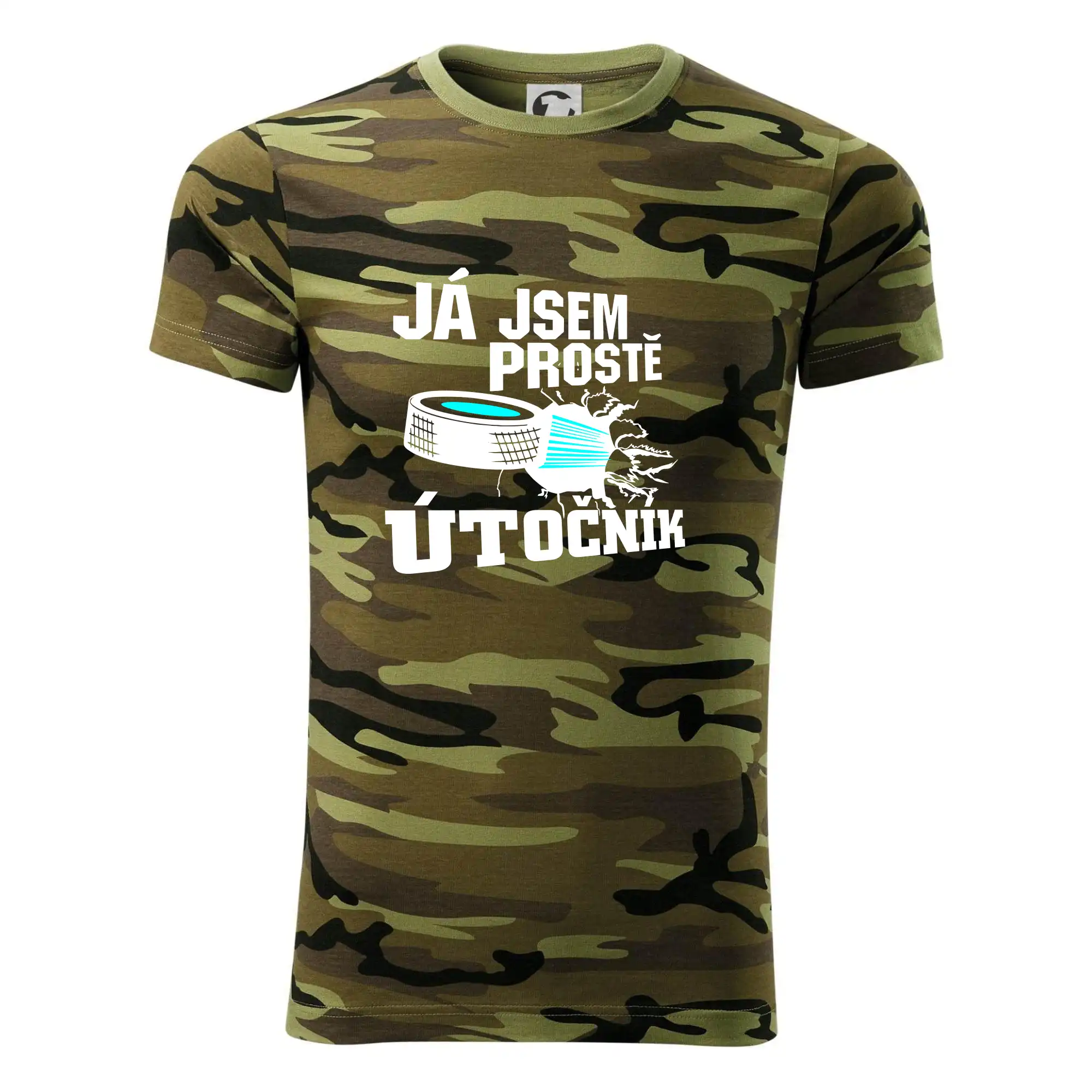 Tričko střední gramáže v barvách camouflage. Střih s bočními švy. Lem průkrčníku ze žebrového úpletu s přídavkem 5 % elastanu. Vnitřní část zadního průkrčníku začištěna páskou v barvě camouflage.