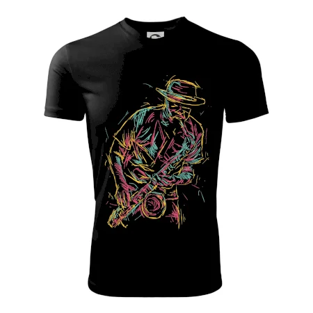 Triko, na kterém je kreslený jazzman, potěší každého příznivce jazzu. Hudební triko se saxofonem je vhodný dárek pro saxofonistu. Pokud je saxofon a hudba na každém tvém kroku, tohle triko se k tobě bude skvěle hodit! Triko pro saxofonistu a pravého jazzmana.