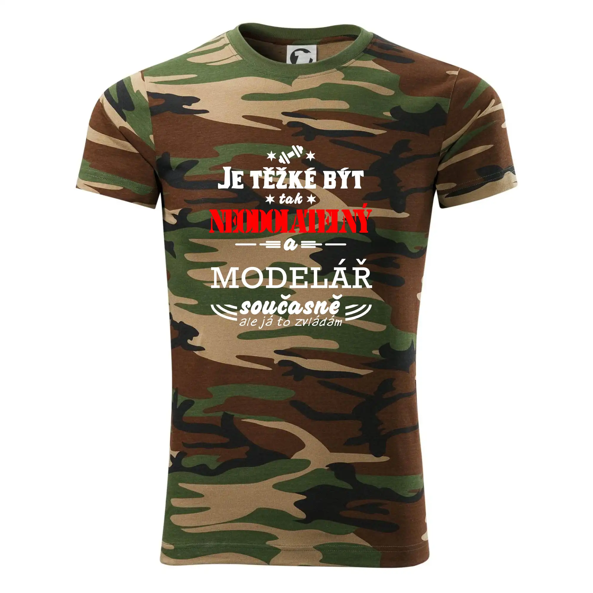 Tričko střední gramáže v barvách camouflage. Střih s bočními švy. Lem průkrčníku ze žebrového úpletu s přídavkem 5 % elastanu. Vnitřní část zadního průkrčníku začištěna páskou v barvě camouflage.
